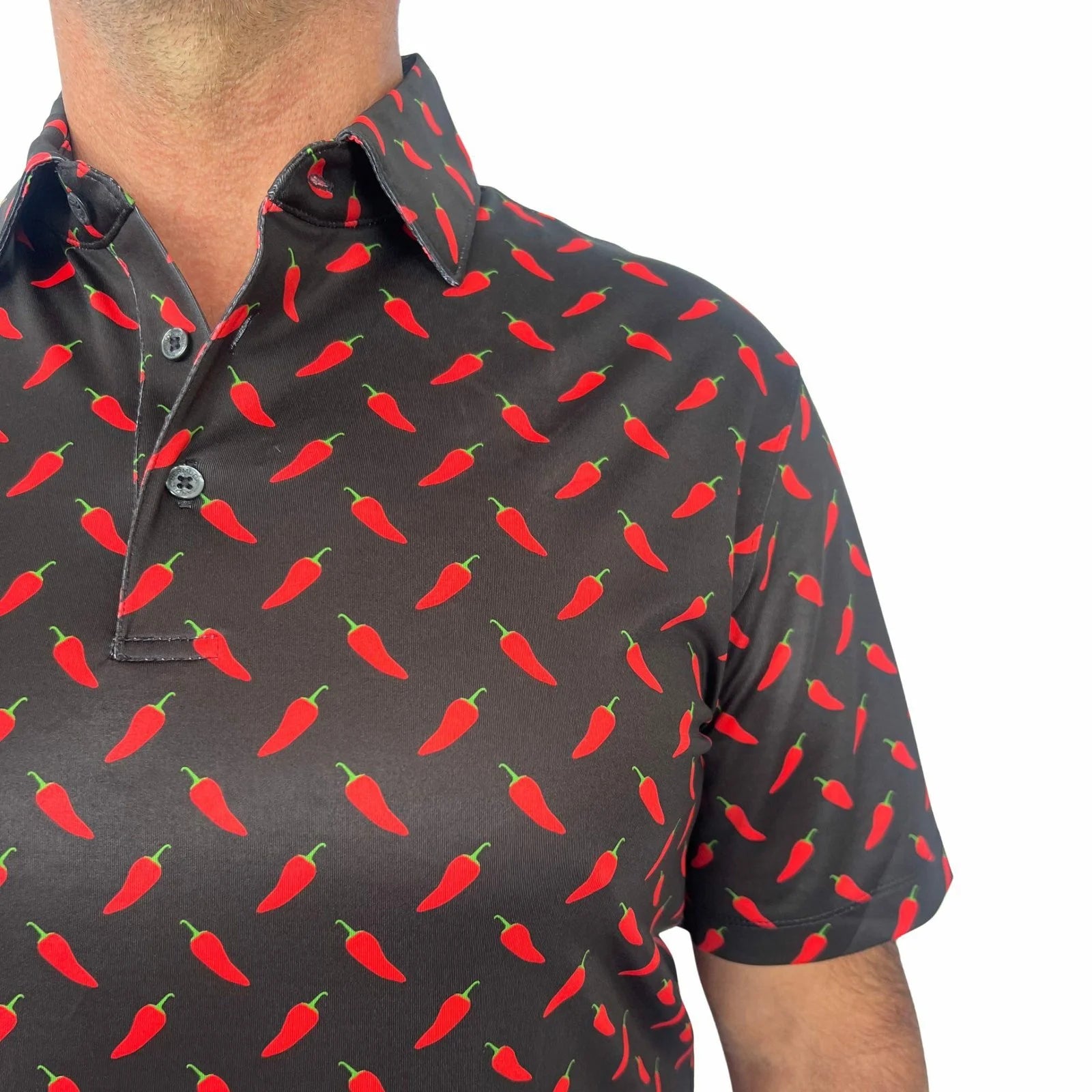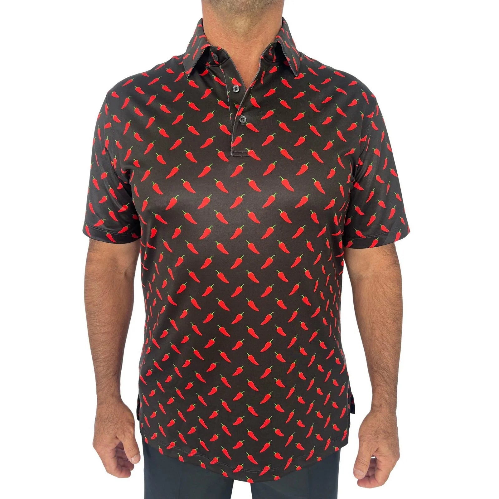 Our Men’s Sam polo, in a chili pepper print, is made with our polyester / spandex jersey fabric, which is soft, lightweight, and breathable, making it perfect for on the course, out on the town or in a casual work environment.